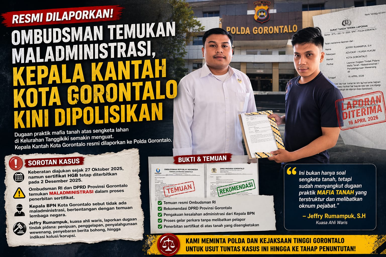 Rekam Fakta, Gorontalo – Dugaan praktik mafia tanah dalam sengketa lahan di Kelurahan Tanggikiki, Kota Gorontalo, kian menguat. Kasus tersebut kini resmi dilaporkan ke Polda Gorontalo pada Jumat, 16 April 2026.